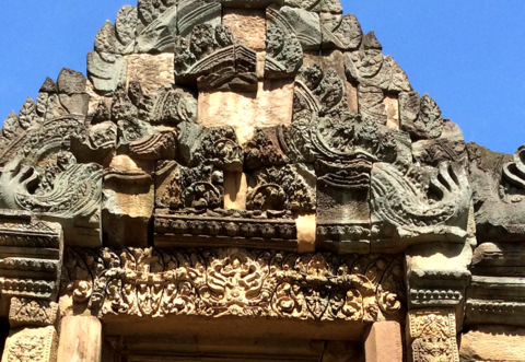 Indra astride Erawan and flanked by two Naga serpents The second lintel is also located in the grounds of the historical park. It was originally in one of the minor towers located to the south. It’s a carving of Indra in the Baphuon art of the 11th C AD.
