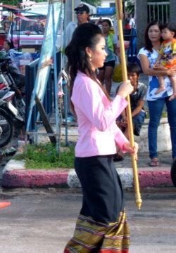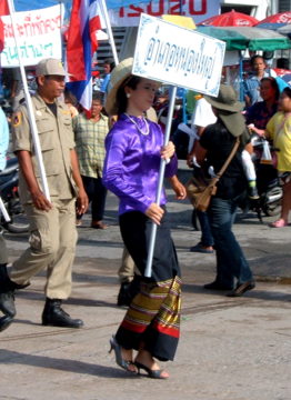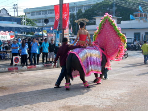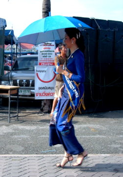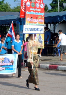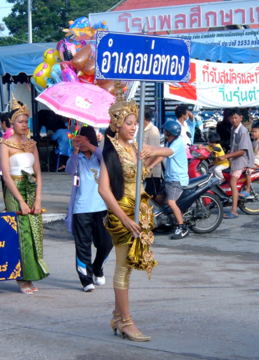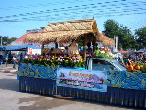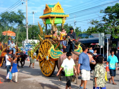 Chonburi is just 80 km south-east of Bangkok, a little over an hour’s drive from Bangkok. Though the province was formed in the reign of King Rama V, communities in this area have existed since the Ayutthaya period in the 14th – 15th century. The Bang Pakong river estuary just north of Chonburi was a favourite stop for Chinese junks since the Sukhothai days in the 13th century. Many settled here, hence the huge ethnic Chinese population in Chonburi where the Chinese heritage is apparent in the temples, schools and festivals in the city. Chonburi (chon – water, buri – city) is well-known for its beaches and ports. Bang Saen and Si Racha are popular beaches with the locals; Naklua, Pattaya and Jomtien are more popular with the foreign tourists. Laem Chabang, the deep sea port on the eastern seaboard, is in Chonburi. The Laem Chabang Industrial Area is just behind the port. The Sattahip naval base is at the southern tip of the province just before we get to Rayong. Table of contents The festival The Chonburi buffalo racing festival is an annual tradition that’s more than a century old. It’s held in the 11th lunar month towards the end of the Buddhist Lent, usually in October. This year, the 139th buffalo racing festival was held from 16 – 22 October 2010. It’s a week-long food and fun fair with music, competitions and sale of handicraft in front of the provincial hall. On the final day of the festival, there was a grand procession in the morning. Representatives from the various districts, schools and provincial organizations paraded their products of fruits and handicraft before the buffalo race. Pretty ladies in traditional dress, dressed-up buffalos, schools bands and floats from the different districts of Chonburi took part in this procession. Here’s a short video of the procession followed by still pictures of the events in order of appearance. Click on this link to view the video ![]() Leading the procession of buffalo wagons There were some novelty items too, like this one. ![]() Beauty and buffalo all dressed up Here were some of the pretty ladies from Chonburi on and off parade that morning. ![]() ![]() The 11 districts of Chonburi (including the city district of the provincial capital) were represented by contingents and colourful floats. ![]() Leading in Bang Lamung district Bang Lamung is a coastal district about 8 km south of Chonburi city, near the beach resort of Pataya. ![]() Float from Bang Lamung district Nong Yai and Bo Thong districts are inland about 10 km east of Chonburi city. ![]() Carrying the banner of Nong Yai district ![]() Bo Thong district ![]() Fruits of Bo Thong ![]() Contingent from Pataya, a special administrative area in Chonburi ![]() Phan Thong district is just north of Chonburi city This was the contingent bringing up the rear of the procession. ![]() A fitting end to a beautiful parade Now that we’ve seen the belles, let’s take a look at the bulls. Table of contents The buffalo race Early in the morning on 22 October, the owners brought their buffaloes to town in pick-ups and trucks. ![]() Contestants arrive in town They were registered according to four weight divisions ranging from heavy to the super light weights. The signs above the registration tables actually say, big, small, tiny and super tiny. ![]() Registration for the race As there were no weighing scales available, I wasn’t sure how the classifications were made. After the registration, the buffalos were then taken to the rest areas to wait for their turn to race. ![]() Waiting for their big moment The Thai water buffalo is frequently the butt of local jokes concerning its low IQ. But this animal has traditionally been the work horse of the rice fields. Though tractors and mechanical ploughs have replaced many of them, with the spike in oil prices, many farmers have turned to the good old buffalo again. ![]() One of the heavies One of my early images of Thailand was that of a young boy astride a water buffalo with the rice fields and setting sun in the background. Since then I’ve always wanted to see a water buffalo up close. I got my chance. ![]() The kid and his pet buffalo In the past, farmers brought their buffaloes to town after the rice planting season to race them as a form of entertainment and recreation. Today however, these buffaloes are bred specially for racing and probably haven’t touched a plough in their lives. ![]() Racing buffaloes They struck me as very calm animals totally unperturbed by the noise, and there was more than enough noise provided by three competing announcers blaring into their loud speakers, the crowds and fuss around them. However, their moods may change under different conditions, as we shall see later. ![]() Go placidly amid the noise and haste, and remember what peace there may be in silence The race track was this open sandy patch a 135 m long in front of the provincial hall. Grandstands were erected on both sides of the length with metal barriers separating the race track and the spectators. ![]() Race track ![]() Contestants and their handlers make their way to the start line Before the start of the race, contestants and their riders were allowed to do a few warm up runs which were entertaining by themselves. ![]() Warm up run ![]() Barely clinging on The starting line was nowhere near the orderly state of a horse race. It took some effort to get the animals into position. Some just changed lanes on their own, others just ran off and the more testy ones threw their riders. Despite their bulk, these buffaloes are surprisingly agile. One even stepped over the metal barriers separating the lanes to get from one lane to another; doing it sideways with his rider astride! The only time I saw some buffaloes get agitated was when their riders tried to mount them. There were a few unintended rodeo displays with several riders biting the dust. They have minds of their own and have often made monkeys out of their riders. ![]() Buffal