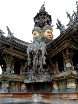 Usual distractions Table of contents Map to the Sanctuary of Truth View Sanctuary of Truth, Pattaya in a larger map How to get there Take the skytrain to the Ekamai station which is right next to the Ekamai Eastern Bus Terminal. From the bus terminal take a tour bus to Pattaya. Take the bus that goes on the toll way. This will save you some time. The fare is 113 baht per trip. Get off at the Pattaya Bus Station in Pattaya North. From there take a motor cycle taxi to the Sanctuary of Truth. The name of the place in Thai is pra-sart-sut-ja-tham in Soi Nakluea 12. The fare is 60 baht per trip. Opening hours and admission The Sanctuary of Truth is open every day from 8 am – 5 pm. Admission is 500 baht per person. Contact information The Ancient City Co Ltd 206/2 M 5 Nalkuea Banglamung Chonburi 20150 Thailand Tel no 038 367 229, 038 367 815 Website www.sanctuaryoftruth.com Table of contents My thanks I like to thank Khun Jaray Invichien and his staff who were extremely helpful and knowledgeable. They have helped me understand the meaning of the Sanctuary of Truth much better than from my first visit. With all the symbolism in the numerous sculptures, I think we will always learn something new with every visit. All photographs are with the courtesy of The Sanctuary of Truth.