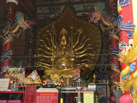 Khun Pornchai even has a homestay service here. His contact details are 77 Mu 8, Tambon Bang Chao Cha, Amphur Pho Thong Ang Thong Tel 66 89 045 3678 Table of contents Wat Muang I’m glad for the suggestion to visit Wat Muang, even though it meant going back to route 3195 which we passed earlier. Wat Muang is a temple in Ang Thong famous for its huge Buddha statue and I missed it out from my initial list. Wat Muang was originally an abandoned temple from the Ayutthaya period and was renovated in the 1980s. In 1991 funds were raised to build the huge Buddha statue that can be seen for miles around. When we entered the temple grounds, we passed a shrine dedicated to the famous Guan Yin, the Goddess of Mercy. The legend tells of a virtuous princess who sacrificed her eyes and arms to save her father from a terminal illness even though he had persecuted her all her life. For her supreme act of forgiveness and sacrifice she attained enlightenment. Kuan Yin is sometimes depicted with a thousand arms with an eye in each palm.