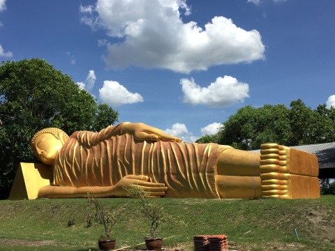 Brief history Khao Loy is an extinct volcano, about 12 km west of Phanom Rung. It was formed as a result of a volcanic eruption 700,000 years ago and the overflow from that eruption resulted in this mountain with its unique shape. After the death of Buddha in 543 BC, his remains were cremated and ashes distributed to his disciples in the various cities in the region. A monk was carrying some of these ashes of Buddha through the South Isarn region when he came across Khao Loy. The mountain appeared to him like a Garuda¹ in a prone position with its wings spread out. It was then decided that this would be one of the places to enshrine some of Buddha’s ashes and the original name of Khao Loy was changed to Khao Phra Angkhan (angkhan – ashes from the cremation of the deceased, it also means the planet Mercury and Tuesday). Over the years abbots from neighbouring temples enlisted the help of local communities to build up the facilities on this holy mountain. In 1954 the people in Ban Charoensuk, a community at the foot of the mountain, built a wagon track leading up to the mountain. Upkeep of the place was limited to the annual merit making ceremonies undertaken by local residents. As a result the sacred place was neglected for a time. Later in 1978 the road was improved for vehicular traffic. Increased road accessibility and donations paved the way for more improvements. In 1981² donations of 1.5 m baht were raised to build the ubosot which was constructed in the following year and the ashes of Buddha were enshrined in the chedi of the temple. ![]() Wat Khao Phra Angkhan Supply of electricity to the temple on the mountain was only established in 1985. In 1994, the Royal Thai Army Engineers built a proper road with a hardened surface up to the temple. This gives an idea of how remote this temple was back in those days. ![]() Road to Wat Khao Phra Angkhan Note: ¹ The Garuda is a mythical half bird half human in Buddhist and Hindu mythology. It’s the mount of the Hindu God Vishnu. The Garuda is the national symbol of Thailand and Indonesia. ² This date is based on the information booklet given to me by a monk at the temple. The information boards at the temple state that the year of construction as 1977. Contents Features of Wat Khao Phra Angkhan Wat Khao Phra Angkhan is on an extinct volcano and has relics that date back centuries though the temple is relatively recent. It’s what the locals call wat pa or a forest monastery; a temple located in remote mountainous or forested areas where conditions are austere and basic. It’s serves as a retreat away from the material comforts of modern life for monks to meditate. Let’s examine some of the salient features of Wat Khao Phra Angkhan. The mountain Khao Phra Angkhan is 331 m above sea level, it’s a large mountain sprawled over an area of 90 sq km a result of the volcanic eruption. Local legend records that it appeared like a Garuda in a prone position with wings spread out and its head pointing south. As a result of this feature, the monk carrying Buddha’s ashes decided to enshrine the ashes on this mountain. Outline of Khao Phra Angkhan Please see the satellite map to have an idea of the shape of this mountain. If the map doesn’t appear, click on this link The area in Khao Phra Angkhan is rich in natural resources which facilitate geological studies of volcanoes and volcanic deposits and botanical studies of the various species of flora in the surrounding forest. In addition, the ancient relics here are of historical, religious and cultural significance. ![]() Foliage around the temple Historical relics Some of Buddha’s ashes are believed to be enshrined here about seven years after his death in 543 BC. The ancient sema or boundary markers made from basalt that mark the sacred site date back to the 8th and 9th C in the Dvaravati period. The carvings on these sema reflect the influence of Brahmanism on Buddhism in this region. ![]() Sema or boundary marker Reclining Buddha As visitors reach the car park to the temple, the first thing they will see is a large Reclining Buddha in gold estimated to be around 35 m long. ![]() Reclining Buddha Ubosot The central attraction in Wat Khao Phra Angkhan is the ubosot or ordination hall in deep red stone with three chedi where Buddha’s ashes are enshrined. This temple is not like any I have seen in Thailand. It’s not Chinese, Thai or Khmer. It’s more like a cultural blend of designs from the different eras. ![]() ![]() ![]() The ubosot There are 109 Buddha statues in the seated posture surrounding the ubosot with eight pairs of sema or boundary markers from the Dvaravati period around the sacred ground. ![]() 109 Buddha statues Inside the ubosot, it’s relatively bare unlike some of the temples in the city. ![]() Inside the ubosot There are some very old and fading murals on the wall depicting the life of Buddha. ![]() Murals on the life of Buddha Other shrines There are a couple of other shrines within the temple grounds but I am unable to identify them. The first building appears to be a very Chinese looking shrine. I only found out later that there is a Guan Yin Shrine dedicated to the Goddess of Mercy in the grounds of this temple. This perhaps could be that shrine. ![]() Chinese looking shrine This second shrine is right on the western edge of the temple grounds almost in the forest with a long flight of steps up to it. This one is beyond me. ![]() On the edge of the forest Today, Wat Khao Phra Angkhan is preserved as a historical site for religious relics and a tourist attraction in Buriram It’s also serves as a Buddhist camp for students to learn the Buddhist way of life. There are few visitors to this quiet temple on the forested slopes of an extinct volcano and it makes a pleasant visit in surroundings where one can feel at peace with nature. ![]() At peace with nature I am grateful to the monk in Wat Phra Khao Angkhan for giving me an information booklet on the histor