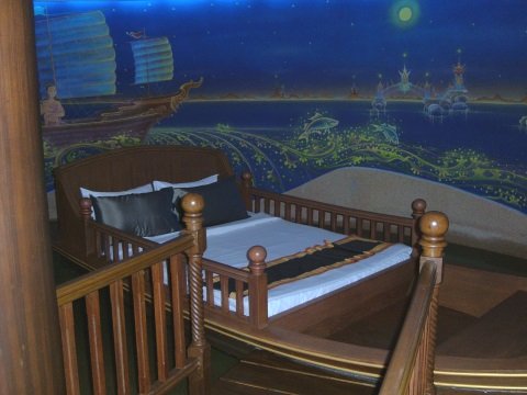 Safety boards have been installed to make sure you don't roll over into the water. Motifs of river life on the walls create an illusion of flowing water to set you drifting off on your pleasant dreams.