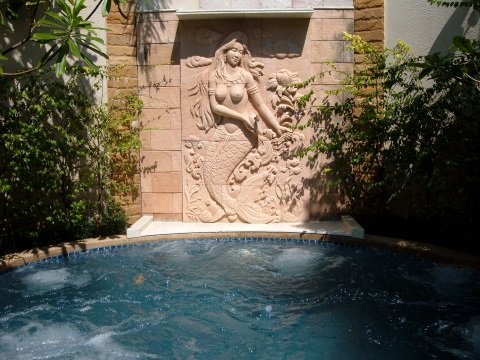 Care to have a taste of living in grand style? Spoil yourself at the luxurious Siam Suite with its indoor pond and waterfall, sauna room and private outdoor swimming area. A wooden step bridge spans the pond separating the bedroom/living area from the sauna/jacuzzi area.