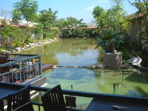The main hotel building and lobby overlook an open restaurant patio by a large pond surrounded with a beautifully landscaped garden.