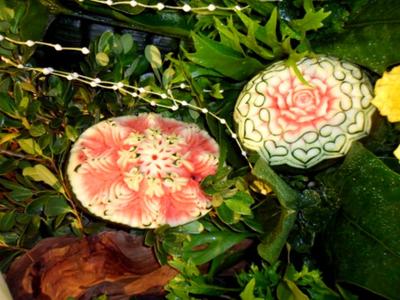 These sculptures are carved from fruits and vegetables during a fruit and vegetable carving competition held at the Grand Mercure Fortune Hotel on 9 August 2012.