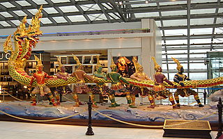 This dramatic scene, which symbolizes the perpetual struggle between good and evil, is captured in a 21 m long sculpture on display at the departure lounge on the 2nd level at Suvarnabhumi Airport.